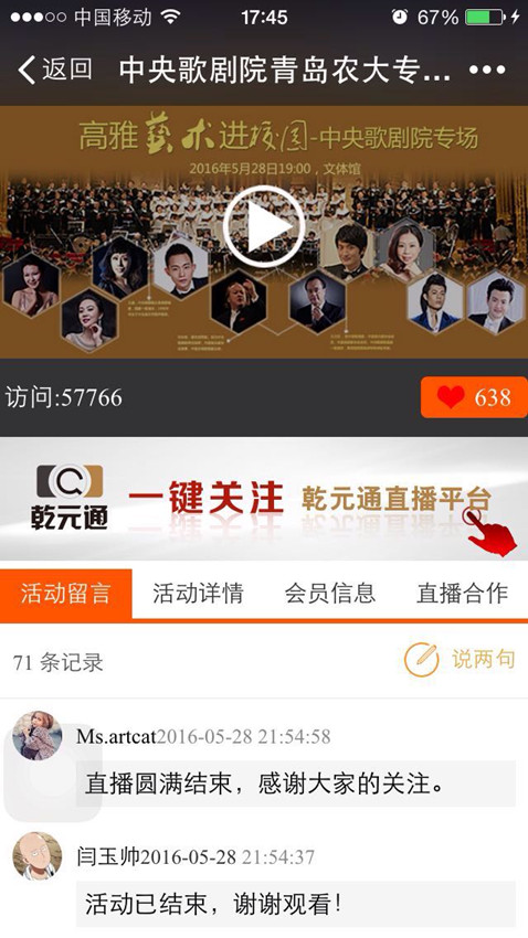 5月28日,中央歌剧院“高雅艺术进校园”青岛农大专场在文体馆举行,乾元通通过微信客户端对演唱会进行了全程直播。